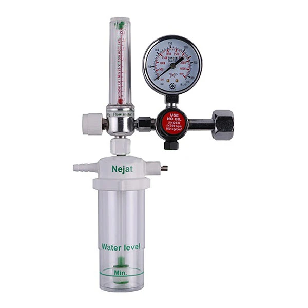 بدنه از جنس برنج با روکش کروم نیکل سخت و مقاومت بالا تنظیم خودکار فشار خروجی بر روی ۶/۳ الی ۵/۵ بار ، دارای تنظیم کننده جریان (فلو/دبی) ۰ تا ۱۵ لیتر بر دقیقه کالیبره شده دارای فیلتر ورودی جهت جلوگیری از ورود اجرام بزرگتر از ۲۰ میکرون به منظور افزایش عمر مفید محصول مجهز به مرطوب کننده آلارم دار اکسیژن به منظور هشدار مسدود شدن مسیر اکسیژن ماسک یا نازال بیمار دارای سوپاپ اطمینان جهت جلوگیری از بالا رفتن فشار خروجی دارای فلومتر از جنس آلومینیوم آنودایز سخت شده.